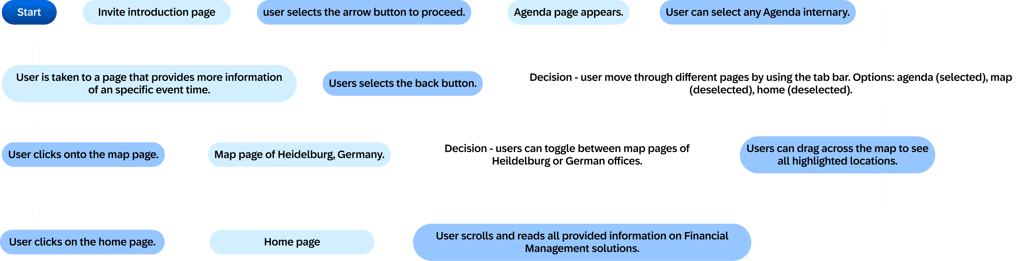 The experience combines agendas, map interactions and financial insights into a unified flow that supports users throughout a multi-venue event.