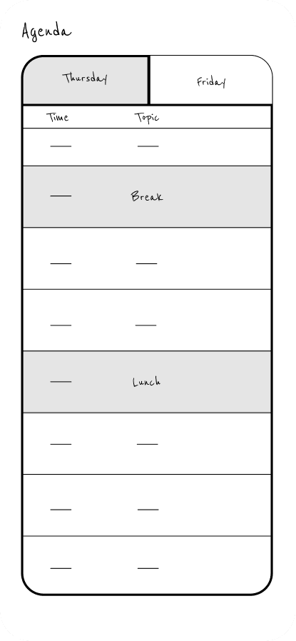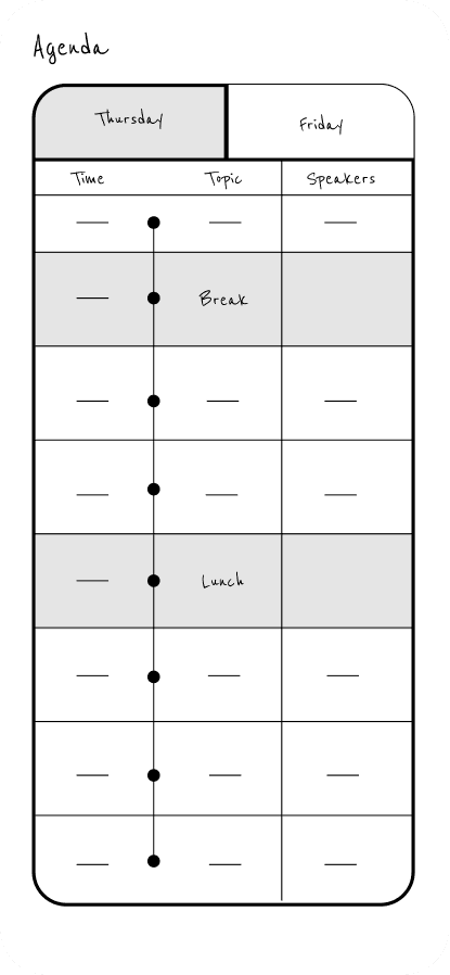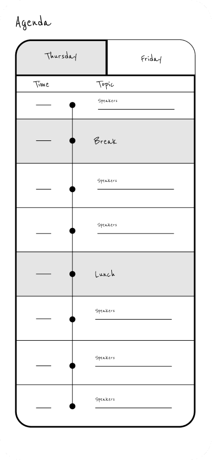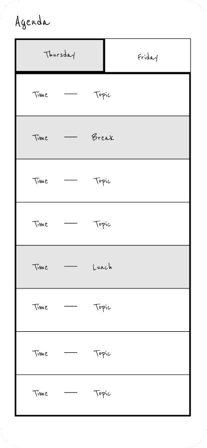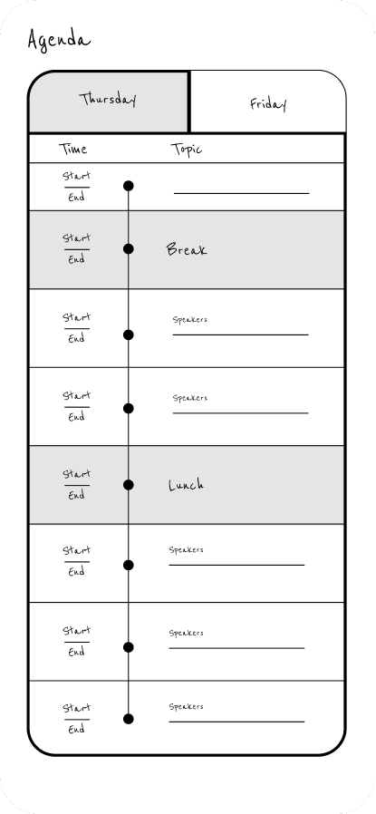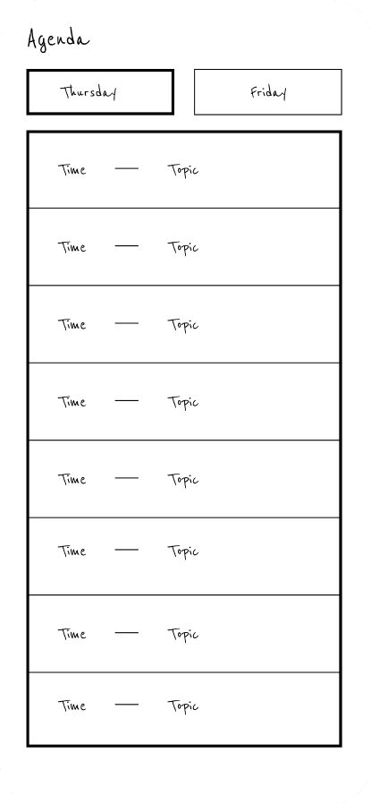 Agenda: Two vertical scroll tracks separate each day with structured, digestible segments