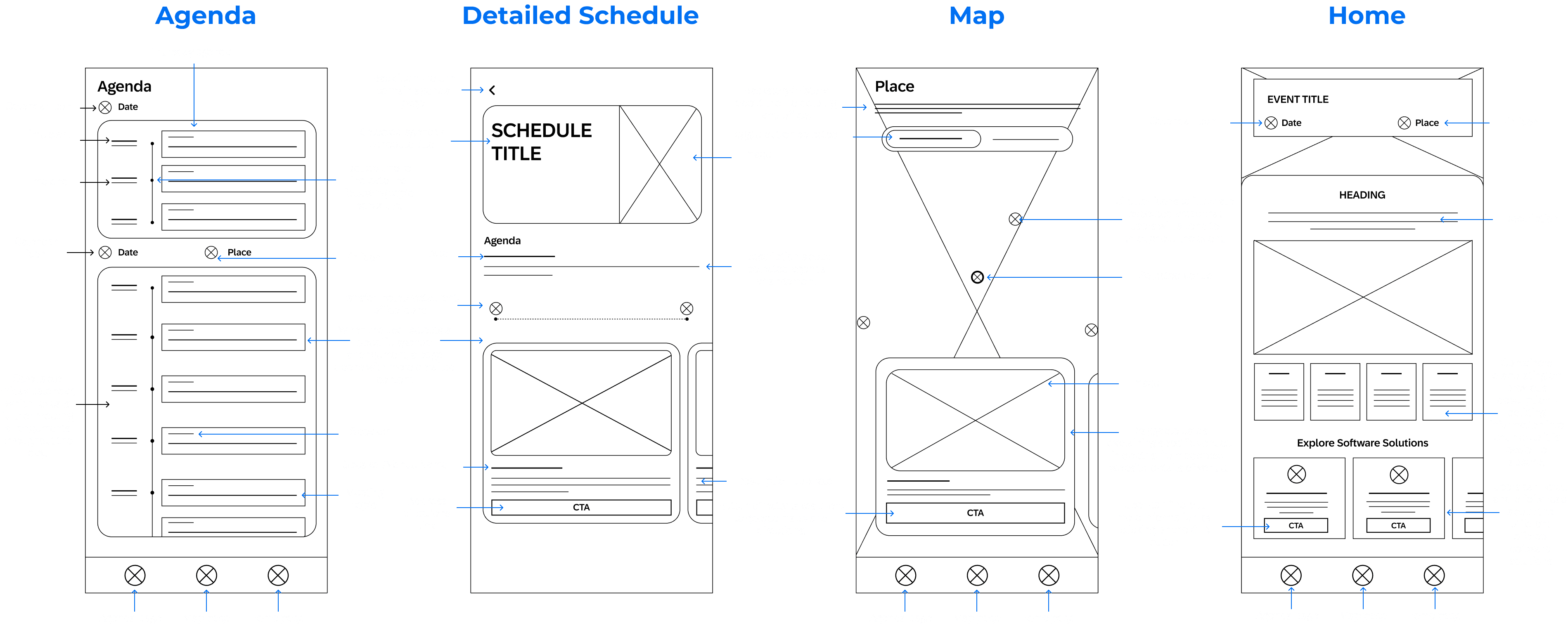 Rapid sketches explored multiple agenda structures and interaction possibilities, leading to early clarity on hierarchy, organisation and tap behaviour.