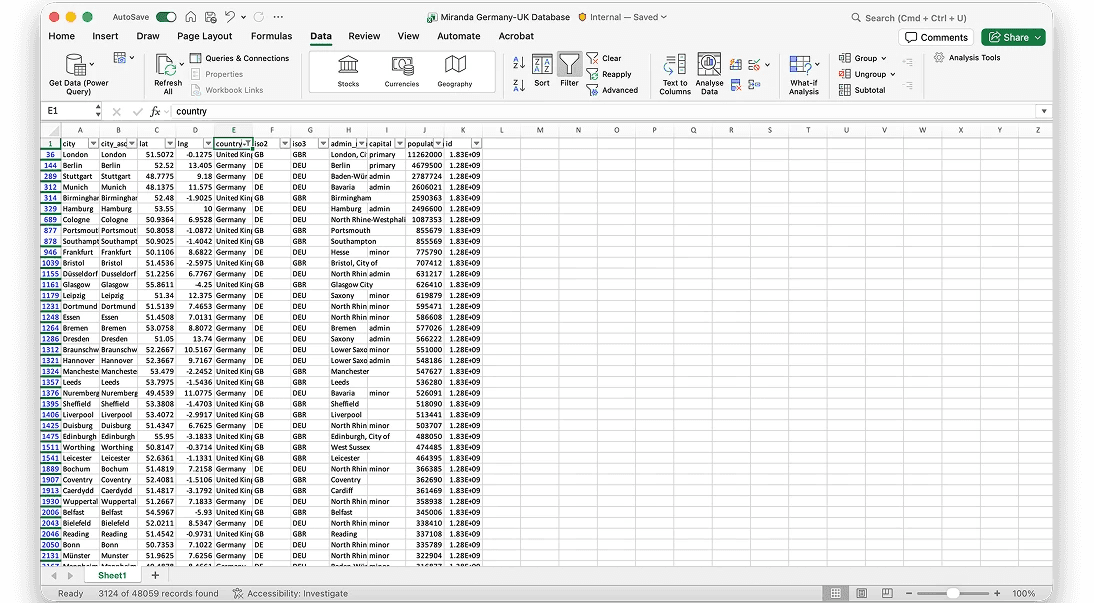 Analysed population patterns through global geographical data. This showed Germany’s distributed urban centres suggesting the need for map designs that support distributed navigation across multiple important locations. In contrast with the UK’s concentrated clusters - supporting more hierarchical or hub-focused mapping styles. This influenced map spacing, pin distribution and layout ergonomics for mobile use.